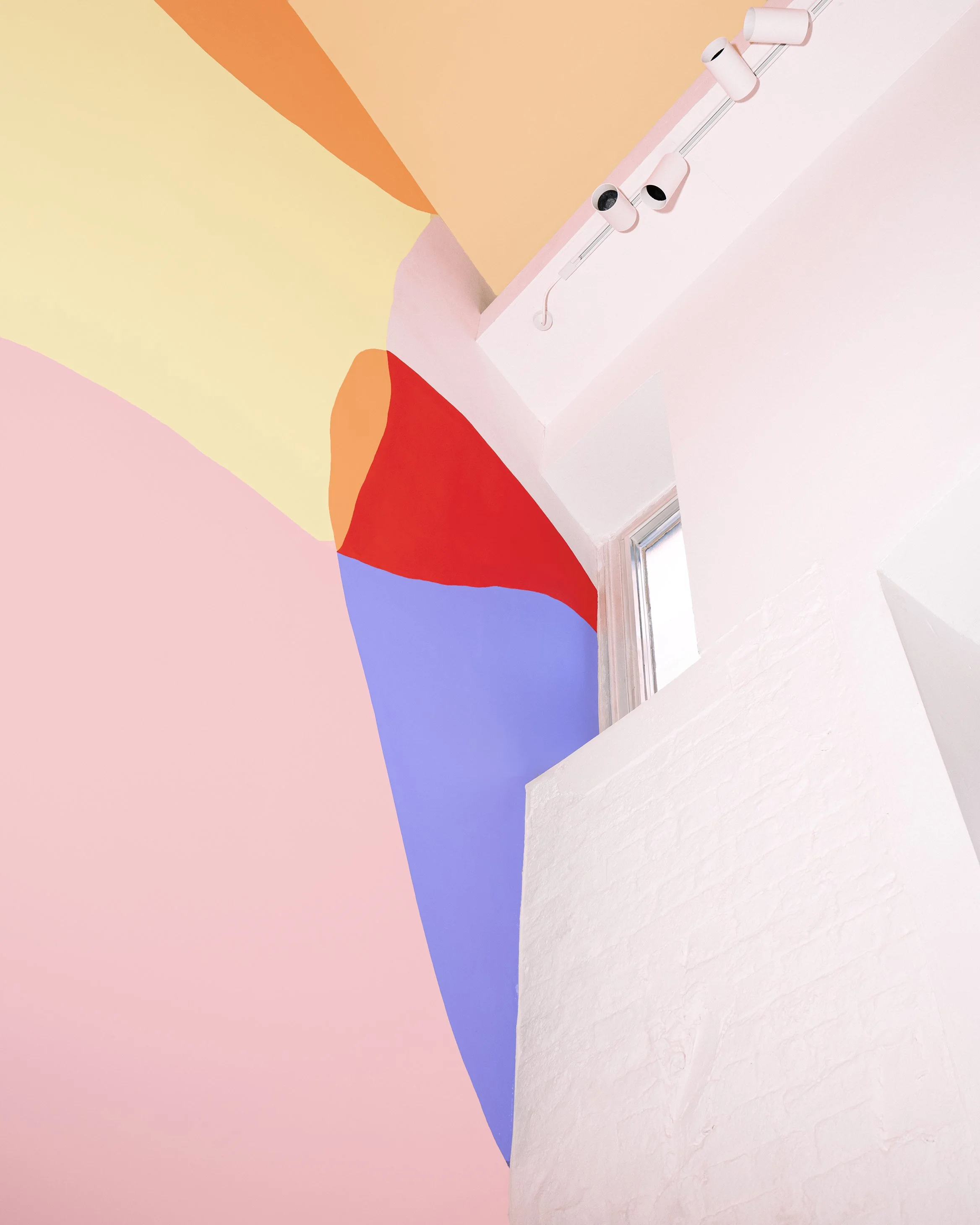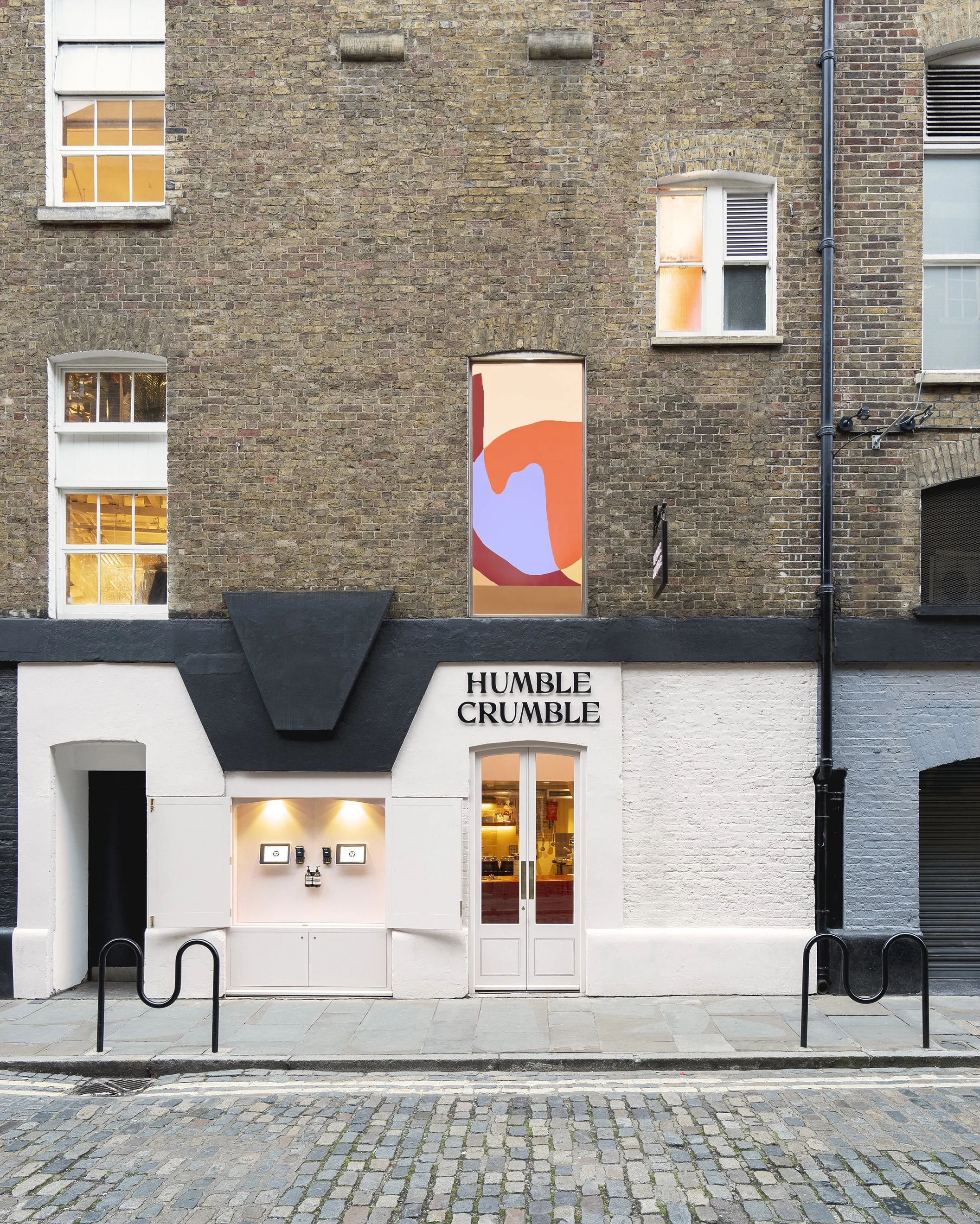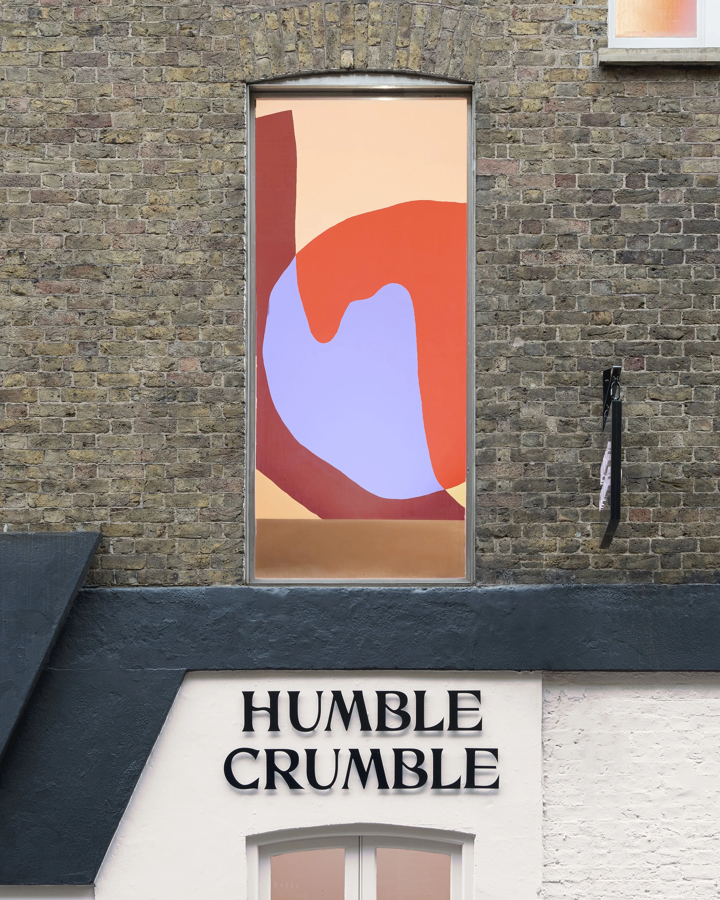 A bold mural of abstract, organic shapes, inspired by Humble Crumble’s ingredients draws the eye upward and fills the space with vibrant colours that harmonise with the interior. Unexpected, dissonant tones create contrast and add a playful twist that subverts expectations.